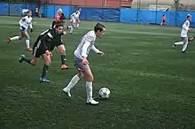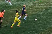 Gülbin Hız (rightmost) driving the ball for Trabzon İdmanocağı in the 2015–16 season's away match against Kireçburnu Spor.