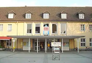 Gütersloh‘s original station building was built between 1845 and 1847 by the Cologne-Minden Railway Company[4] at the end of today's Kökerstraße. Two side wings were added in 1876/77 and the Königliche Eisenbahndirektion Hannover (railway division of the Prussian state railways of Hanover) built another extension at the turn of the century. After the neo-classical entrance building was demolished for the quadruplication of the Hamm–Minden line, Deutsche Reichsbahn-Gesellschaft (DRG) opened a new monumental station building at its present location on the street then called Queckwinkel on 21 December 1925. The extensive rebuilding of the extensive rail facilities, which replaced all the level crossings with underpasses, was completed in 1930 with the opening of the new freight yard beyond the freight tracks on Langer Weg. The ticket hall and the south wing (with the ticket office, express freight and baggage handling facilities) were damaged by air raids on 14 March 1945 and blown up by American troops in April 1945. For about six years it was necessary to buy tickets and to despatch baggage a temporarily constructed shed on the station forecourt. Deutsche Bundesbahn (DB) incorporated the north wing, which was still-standing and included a station restaurant and waiting room, in the reconstruction. The new south wing was built on the foundations of the previous building as an extended building and reinaugurated on 3 October 1951. With the completion of the new entrance hall in a simpler form in 1953, today's station had taken form adjoining the eastern end of inner city.[5][6]