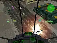 G-Police is a shooter game in which the player pilots a VTOL aircraft, described by critics as "jet helicopters" or "a helicopter without the rotors".[5][6] The player can choose to view the action from a variety of first- or third-person perspectives,[7] including views from within the cockpit, a variety of "chase" perspectives, including directly from above the craft (for use when bombing).[8] Combat in G-Police involves both dogfighting with other aircraft[9] and dropping bombs. The player is often required to "scan" suspect vehicles to determine if they are criminal or hostile.[8]