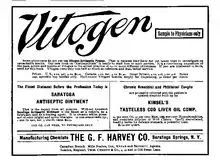 The company was started around 1880[1] by George F. Harvey, originally from Vermont, who moved to Saratoga Springs and began operations out of his home on Church Street. There he developed and improved machinery to manufacture medicine in pill form, a major improvement on the then-common liquids and powders.[2] In 1889 Harvey went into business with Sidney Rickard and New York State Senator Edgar T. Brackett. The three incorporated the G.F. Harvey Company with a capital of $250,000 and constructed a three-story building on Waterbury Street in Saratoga Springs for manufacturing.[3] By 1907 the company employed 100 people plus 66 traveling salesmen.[4]