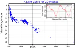 A visual band light curve for GQ Muscae. The main plot shows the decline from the 1983 eruption, plotted with data from the AAVSO,[1] Whitelock et al.[2] and Liller.[3] The inset plot (adapted from Narloch et al.[4]) shows the post-eruption variability seen in 1992.