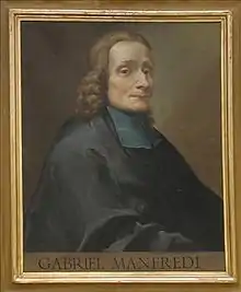 Gabriele Manfredi was born in Bologna, then in the Papal States, on 25 March 1681. He was the son of Alfonso Manfredi, a notary from Lugo, Emilia-Romagna, and Anna Maria Fiorini. His elder brother Eustachio studied law, then turned to science. Gabriele and his brother Eraclito studied medicine, while his fourth brother Emilio became a Jesuit preacher. His two sisters Maddalena and Teresa were also well educated, and later collaborated with their brothers in their work. Gabriele became uncomfortable with the study of anatomy, and turned to other subjects before he and Eustachio were introduced to the new subject of differential calculus.[1]