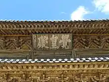 The roof has been re-tiled multiple times since the renovations of the 1930s. The tiles on the upper tier are of the traditional Korean style (guwa), and include a combination of hand-made and machine-made tiles, several of which notably bear a stamp that reads "Repaired in the 12th and 13th year of Shōwa" (1937 to 1938);[48] the lower tier has modern machine-made tiles only. The eaves alternate between crescent-shaped tiles (ammaksae) carved with double-headed dragons bisected by an inscription with their year of production (1967 or 1999), and circular tiles (sumaksae) with either a ten-leaf lotus flower or the syllable om in Sanskrit. Perched at the ends of the ridge line and the corners of the eaves are decorative tiles (mangwa) identical to the crescent-shaped eave tiles. The ones at the bottom of the gables, though dating to 1938, were modeled after the original tiles from 1700 and include the names of financial contributors to the roof work.[42]