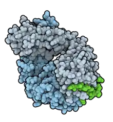 ![]() Fab fragment of gantenerumab (blue) encircling and binding an Aβ(1–11) fibril (bright green). PDB: 5CSZ. | |