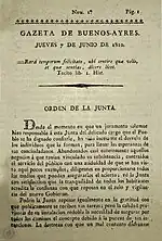 The Gazeta de Buenos-Ayres (sic) (English: Buenos Aires gazette) was a newspaper originating in Buenos Aires, United Provinces of the Río de la Plata, in 1810. It was initially used to give publicity to the government actions of the Primera Junta, the first post-colonial Argentine government. In the beginning it was written by Mariano Moreno, with the aid of the priest Manuel Alberti; Manuel Belgrano and Juan José Castelli were also part of its staff.