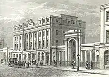 The GPO adjoined the offices of the Inland Revenue on Waterloo Place and housed offices for other public bodies, including the Commissioners in Lunacy for Scotland and the Scottish Meteorological Society.[2] The new building replaced the post office built 1815–19 on Waterloo Place beside Regent Bridge, and it was twice extended to meet increasing volumes of demand, first from 1890 by Walter W. Robertson and then 1908–09 by William Thomas Oldrieve.[1][3] In 2000 the interior was removed, to be replaced by commercial office space, leaving only the High Renaissance-style facade.[1]
