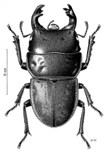 Including their large mandibles (used for fighting over mates), male specimens range in length from 25.5 to 32.8 mm and are 10.4–12.4 mm wide. Females range in length from 20.0–22.5 mm. Their exoskeleton is black and ranges from dull to moderately glossy. The thorax is back, glossy, and wider than it is long. The elytra are rounded at the posterior, almost equally long and wide, and covered in short branching hairs.[3] Male beetles have three teeth at the apex of the mandibles; females have two. What distinguishes this species from all other New Zealand stag beetles is a long conical vertical tooth, on the top of the mandible, in both sexes.[4]