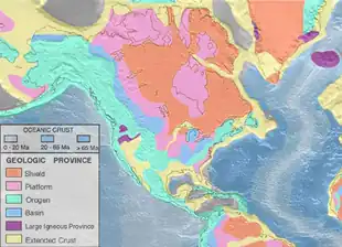 The divisions of regional geology are drawn in different ways, but are usually outlined by a common geologic history, geographic vicinity or political boundaries. The regional geology of North America usually encompasses the geographic regions of Alaska, Canada, Greenland, the continental United States, Mexico, Central America, and the Caribbean.[1] The parts of the North American Plate that are not occupied by North American countries are usually not discussed as part of the regional geology. The regions that are not geographically North American but reside on the North American Plate include parts of Siberia (see the Geology of Russia),[2] and Iceland, and Bermuda. A discussion of North American geology can also include other continental plates including the Cocos and Juan de Fuca plates being subducted beneath western North America. A portion of the Pacific Plate underlies Baja California and part of California west of the San Andreas Fault.