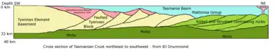 Active seismic exploration reveals the nature of the deep crust. It shows that the Tyennan block plumbs the depth to the moho which is about 33 km underneath. The Tyennan Block slopes below the Adamsfield-Jubilee Element. Under the Tasmania Basin the block is stretched, with faults in to several large blocks that have tilted down. Above these the Adamsfield-Jubilee Element sediments have filled in the topography. Below the north east element the moho is 36 km deep with alternating seismically fast and slow rocks in the mid crust. The Tyennan Block and the Rocky Cape Element have a boundary that dips at 30° to the east to the base of the crust. The Dundas Element lies on top of this boundary.[31] A shallower Moho occurs under the Rocky Cape Block at 26 to 28 km. A deep segment is found under the central north of the state, down to 34 km. Shallower moho depths also occur under southeast and southern Tasmania. A low seismic velocity zone occurs under the Tamar Fracture System. East of this zone is the Northeast Tasmania Block with higher seismic velocities. The high speed zone boundary meets the east coast near Little Swanport, Tasmania but the high speed zone also includes Maria Island and Forestier Peninsula.[32] the Bass Strait is a low seismic velocity zone.
