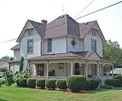 The George R. Lutz House is a 2-1/2 story Queen Anne structure covered with clapboard. It has a hipped roof with front and side gable projections. The facade features a fine example of a wraparound Eastlake with a lattice work base, spool-and-spindle frieze and balusters, and decorative brackets. The house has a variety of window shapes, including small rectangular windows in the gable ends. [2]