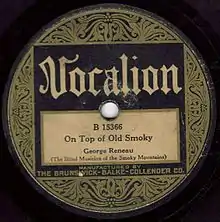 George McKinley Reneau (May 18, 1902 – June 5, 1938) was an American blind street musician who became one of country music's earliest recording artists. Known as "The Blind Musician of the Smoky Mountains", Reneau recorded more than 50 songs on the Vocalion and Edison labels in the mid-1920s.[1][2] While he is credited on his early recordings as a solo artist on vocals, guitar and harmonica, the singing on many if not most of his songs was by an uncredited Gene Austin, a vaudville performer and Tin Pan Alley composer who would become one of the most successful recording artists of the era.[3][4]