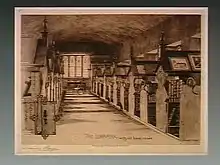 Getrude Ellen Hayes' etching The library with old bookcases, Cheltenham.