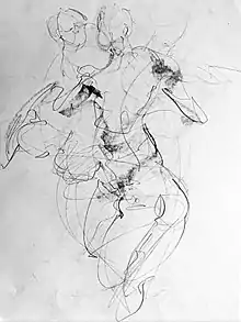 A gesture drawing is a laying in of the action, form, and pose of a model/figure. Typical situations involve an artist drawing a series of poses taken by a model in a short amount of time, often as little as 10 seconds, or as long as 5 minutes. Gesture drawing is often performed as a warm-up for a life drawing session, but is a skill that must be cultivated for its own sake.