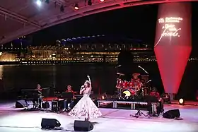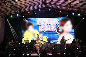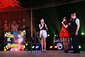 Stage backdrops are usually made of cardboard and cloths painted in bright colours, vibrantly illuminated by coloured spotlights. The performers normally don loud and glittery clothing. Some getai hosts indulge in crude humour; others maintain quick-witted dialogue, joking about local and current affairs, sometimes switching between Mandarin, local Chinese dialects, and even English and Indian languages. Younger people in Singapore may relate to Getai as kitsch, while older people enjoy dancing and singing along to familiar songs, often in Hokkien.[4] Traditional singers such as Liu Lingling tend to dress conservatively, while young performers drawn to getai may choose more revealing outfits. The first row of seats at getai performances are also typically left empty and blocked off from the public as they are reserved for spirits and deities whom Chinese communities believe will return to the world of the living during the Hungry Ghost Festival.[5] In Singapore's contemporary getai scene, performances feature local artistes such as the Baobei ("Darling" in Mandarin) Sisters and even international singers such as Hao Hao and Ya Ya from Taiwan, Bai Hui Mei from Hong Kong and Malaysia's "Little Princess", Li Bao En.[6]