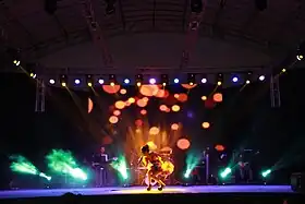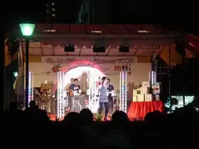 A groundbreaking getai performance was organised by getai veteran Peter Low in 2006. The act showcased a twelve-hour program featuring many famous performers gracing the stage and bringing the crowd to their feet. In keeping up with trends and technology, stage design has shown major changes throughout the years, including upgrading sound systems and adding LED Panels.[38] On 31 July 2011, getai performances were also held at Orchard Road Ngee Ann City Civic Plaza for the first time with these new sound and light systems. As it was the first getai show to be held in the shopping strip in front of a wider audience, including tourists, instead of the usual open fields in neighbourhood areas, the show did not feature any crude humour and scantily clad dancers or singers.[39][40]