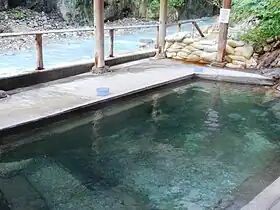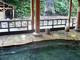 The area is in the center of Kurikoma Quasi-National Park and the hotel is located near the narrow and shallow river with a crystal clear water.[3] There are 5 baths with hot water and also colder water coming from underground springs.
