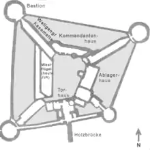 This well-fortified castle was built in the shape of a trapezium. It was surrounded by ramparts and a moat up to 50 metres wide. The immediate vicinity could be flooded to create a swamp. Stone bastion towers were built on the four corners of the site. These were linked to the castle by underground rampart passages (Wallgänge) in the form of casemates. A 45 metre long section is preserved today that led to the north bastion. Today it is used to house exhibitions for the castle museum. The original entrance to the castle was over a bridge on the narrow side of the castle moat in the southeast, that led to the gatehouse. Today the main entrance is through the old south bastion which has been reconstructed using sections of wall arranged in a circle. The following castle buildings are grouped around the inner courtyard: