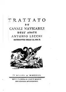 - Trattato de' canali navigabili dell'abate Antonio Lecchi matematico delle LL.MM.II. In Milano. nella stamperia di Giuseppe Marelli. 1776. Repr. Giovanni Silvestri, 1824.