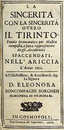 - Il Tirinto (opera in 3 acts), co-authored with Filippo Acciaiuoli, set by Bernardo Pasquini, Ariccia, 1672[7]
