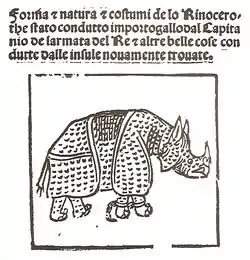 The frontispiece of his work states "Forma & Natura & Costumi de lo Rinocerothe stato condutto importogallo dal Capitanio de larmata del Re & altre belle cose condutte dalle insule nouamente trouate"" (English: The Shape, the Nature and the Way of the Rhinoceros brought by the Captain of the Portuguese King's Armada and other beautiful things brought from the new insulars). This work was published on July 13, 1515 (about 10 cm × 9,5 cm) and depicts the oldest representation of the rhinoceros since Roman times, of a specimen known by its Gujarati name of Ganda, presented to King Manuel I of Portugal, by Afonso de Albuquerque in May 1515.[1][2] It is thought to have influenced Dürer's Rhinoceros.[3]