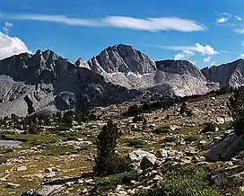 Giraud Peak is a 12,608-foot-elevation (3,843-meter) mountain summit located west of the crest of the Sierra Nevada mountain range, in Fresno County of northern California, United States.[3] It is situated in the Palisades area of northern Kings Canyon National Park, 3.0 miles (4.8 km) southwest of North Palisade, and 1.5 miles (2.4 km) southwest of Columbine Peak, the nearest higher neighbor.[1] Giraud Peak ranks as the 258th-highest summit in California.[2] Topographic relief is significant as the west aspect rises 4,400 feet (1,300 meters) above LeConte Canyon in less than two miles. On the direct opposite side of the canyon The Citadel stands guard. The first ascent of the summit was made September 1, 1925, by Norman Clyde via the east arête.[4]