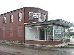 The former Giroux Furniture Company Building is located in central St. Albans, on a block bounded by Market, Lake, and Catherine Streets. It is set directly Lake Street from the Central Vermont Railway Office building, and across Market Street from the main railroad tracks. The front portion of the building is triangular in shape, an artifact of the historic alignment of Market Street, which angled toward Federal Street east of the railway office. It is two stories in height, built out of wood frame faced in brick veneer. A single-story showroom facade is built along the angled side of the building. To the rear of the triangular section is a large two-story warehouse of similar construction.[2]