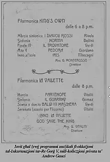 On 18 May 1913, the Vilhena Band of Monterosso took turns on the stage with the King's Own Band ("Banda Ufficiale del Re") directed by maestro Aurelio Doncich, in the Argotti Garden in Floriana, for a fundraiser to be donated to the assisted by the Vilhena Society, a charity. On that occasion, the inhabitants of Floriana competed with the Vessillo Patrio march by Nerik Xuereb and the Omaggio ai Florianesi,[27] that Monterosso had written in a few months, immediately after his arrival in the then suburb of Floriana. At the end of the evening, the two musical ensembles gave voice to the English anthem God Save the King[28] In the celebrations desired by Pius X for the "XVI Centenary of the peace and freedom of the Church", Giuseppe Monterosso conducted the "Vilhena Band" twice, on 13 and 14 September 1913.[29] While, in the celebrations for the 25th anniversary of the appointment of Pietro Pace as bishop of Malta, the Vilhena was the protagonist of a concert held on 17 February 1914 in the Giardino Argotti during the social dinner organized by the parish priests of Malta in honor of their pastor.[30]