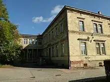 In 1982, the building was declared a national monument.[4] Since the station staff was withdrawn in the 1990s, the building has been unused and is empty. Damage caused by decay are clearly visible. In many places the plaster has crumbled and the decorative elements are partially destroyed.[4] It is now also listed in the heritage list of station buildings.[9] In the autumn of 2012, the station building was bought by an investor for renovation and use to house shops, refreshments and services, particularly for the Federal horticulture show (Bundesgartenschau) that is taking place in the region in 2015.[10]