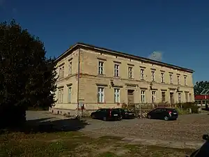 The station building, which dates from the building of the line, is to the west of the road to Havelberg and south of the tracks, on the side facing away from the town. It was probably designed by the planning director of the Berlin–Hamburg Railway, Friedrich Neuhaus together with Ferdinand Wilhelm Holz.[6] The basic design of the building is similar to Ludwigslust station and the original Boizenburg station building, which no longer exists.[7] The two-story building with a flat hip roof has an L-shaped ground plan. The outer side facing north on the side of the tracks has six portals and the side facing east towards the federal highway has nine portals. This asymmetric plan differs significantly from most other station buildings on the Berlin–Hamburg railway.[4] The shape of the building, unlike some other stations of the Berlin–Hamburg railway, has not been altered by later additions with the exception of a loggia[6] attached to the inside of the courtyard after 1859. Living quarters were established in the longer wing of the building and the waiting rooms among other things were located in the shorter wing.[4]