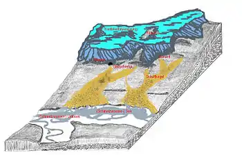 The bowl-shaped basins, which were formed by the scouring of the ground by the glacier, were called Zungenbecken ("tongue basins"), because the tongue or snout of the glacier was once located here.[3] In these basins, if there was no outlet, glacial lakes (Gletscherrandseen or Zungenbeckenstauseen) were formed during the retreat of the glacier. There is a number of lakes of this type in the Salzkammergut, for example. Typical landforms within the Zungenbecken of the Alpine Foreland are drumlins, but there are rarely any tunnel valleys. Around the Zungenbecken on the edge of the former ice sheet, are ridges of glacial till known as terminal moraines.