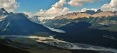 Glacier Lake was named by Sir James Hector of the Palliser expedition in 1858 for the fact the lake is fed from glaciers, specifically the glaciers of the Lyell and Mons Icefields[2] as well as the Forbes North Glacier. The lake is surrounded by Mount Outram, Division Mountain, Mount Erasmus and Survey Peak. The lake is fed and discharged by the Glacier River, which is a tributary of the Howse River. The lake can be accessed via a 8.9 kilometres (5.5 miles) trail which starts near Saskatchewan River Crossing along the Icefields Parkway.[3] Park at the Glacier Lake trailhead (at the end of a short unnamed road 1.1 km (0.7 mi) west of the David Thompson Highway turn-off).
