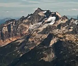 Gladsheim Peak in upper left edge. "Wedge" furthest to right. In between are the subsidiary peaks on Gladsheim's east ridge with unofficial names West Molar, East Molar, West Hump, and East Hump