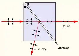 A Glan–Foucault prism (also called a Glan–air prism) is a type of prism which is used as a polarizer. It is similar in construction to a Glan–Thompson prism, except that two right-angled calcite prisms are spaced with an air gap instead of being cemented together.[1] Total internal reflection of p-polarized light at the air gap means that only s-polarized light is transmitted straight through the prism.
