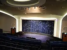 In 1986 GFT became a registered charity and embarked on a campaign to raise money for a second cinema to replace the old basement conference room. Screen 2 (with seats for 142), and the downstairs café-bar Café Cosmo, opened for business in 1991. Edinburgh-based architect James Doherty returned in 1998 to revamp the foyer; in a nod to the original design, the new foyer includes a mosaic globe designed by American Glasgow-based artist Todd Garner set into the floor. In the same period, new sets of curtains were commissioned from Glasgow School of Art graduate Adrienne Brennan (Screen 1) and Glasgow studio Timorous Beasties (Screen 2),[7] both of which reference the ‘cosmos’ in their design.