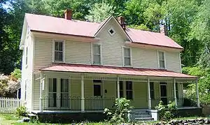 The 2+12-story house is built close to the road on fieldstone foundations. There are two porches, one on the east side of the house on the second story, one in the front, and another on the south end. All of them have shed roofs and are supported by wooden posts. There are two-over-two double-hung windows, some flanked by wooden louvered shutters. At the south end of the house, two of the windows extend down to the porch. There are also six light-casement windows on the south gable end and a diamond-shaped window on each side of the east and west cross gables. The roof is gabled with cross-gabled peaks on the eat and west elevations. The roof itself has a red raised seam metal covering. The house has 2 interior chimneys and an exterior chimney at the north gable end.