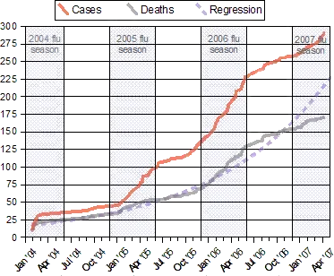 • In June 2006 WHO predicted an upsurge in human deaths due to H5N1 during late 2006 or early 2007 following a summer/fall lull in most countries, as H5N1 appears to be somewhat seasonal in nature. In July and August 2006 significantly increased numbers of bird deaths due to H5N1 were recorded in Cambodia, China, Laos, Nigeria, and Thailand while continuing unabated a rate unparalleled in Indonesia.