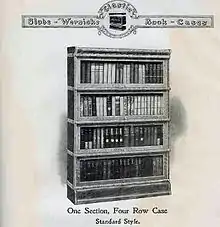 The company patented the "elastic bookcases" also known as a modular bookcase or barrister's bookcase. These were high-quality stacking book shelves, with a standard width of 34 inches, in oak, walnut and mahogany, capable of being adapted to fit together to form a bookcase which could either be all of the same measurements or which could be rearranged by the insertion of units of different depths and heights. These glass-fronted shelves are today collectible antiques highly desired by collectors. With regularity, these bookcases appear in auctions and internet sites and, what originally cost $75 or so will now be sold for $900 or more.[1]