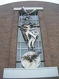 Glory is a sculpture created by American artist Garry R. Bibbs in 1999. The sculpture is installed above the entrance to the J. F. Miller Center, at the corner of West Michigan Street in Indianapolis, Indiana. Glory is made from fabricated steel and bronze. Angels and trumpets are the two distinct images visible within the sculpture. The sculpture is very large, with dimensions of 80 ft x 40 ft x 1 ft. Gibbs signed his name to the sculpture and included a copyright sign.
