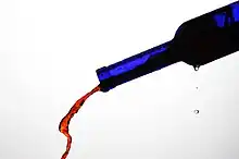 As liquid is poured from a bottle, the air pressure in the bottle is lowered, and air at higher pressure from outside the bottle is forced into the bottle, in the form of a bubble, impeding the flow of liquid.[3] Once the bubble enters, more liquid escapes, and the process is repeated.[3] The reciprocal action of glugging creates a rhythmic sound.[4] The English word "glug" is onomatopoeic, describing this sound.[5] Onomatopoeias in other languages include Gluckern (German).