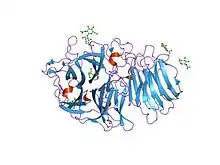 In molecular biology, glycoside hydrolase family 32 is a family of glycoside hydrolases EC 3.2.1., which are a widespread group of enzymes that hydrolyse the glycosidic bond between two or more carbohydrates, or between a carbohydrate and a non-carbohydrate moiety. A classification system for glycoside hydrolases, based on sequence similarity, has led to the definition of >100 different families.[1][2][3] This classification is available on the CAZy web site,[4][5] and also discussed at CAZypedia, an online encyclopedia of carbohydrate active enzymes.[6][7]