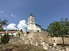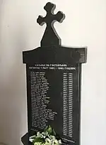 At least 19 Serb civilians from the village were massacred on 6 August 1995 during the Croatian Army's Operation Storm.[5] A monument was built outside the church commemorating the victims and it contains the names of 34 people killed during the war. On October 2, 2011, the Croatian government issued a ban on a commemoration gathering, ordering the church to remove the monument as "two thirds of the place that the monument was built on belong to the state and that only one third belongs to the Serbian Orthodox Church (SPC)." and "the ban has removed danger of bigger incidents and unrest".[6]