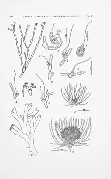 - ↑ Kugrens, P.; Delivopoulos, S. G. (1986). "Ultrastructure of the Carposporophyte and Carposporogenesis in the Parasitic Red Alga Plocamiocolax pulvinata Setch, (Gigartinales, Plocamiaceae)". Journal of Phycology. 22 (1): 8. doi:10.1111/j.1529-8817.1986.tb02509.x. S2CID 85787751.