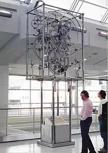 This led to a One Man Clock, a Three Man Clock (the Clock Junior), a Water Clock (Bradt, 1990), and eventually to a Seven Man Pedestal Clock. Bradt was issued a U.S. patent in 1992 for the pedestal device, titled "Animated Kinetic Sculpture Device" (Bradt, 1992). Soon Bradt was building Grandfather Clocks in his studios based on the Seven Man Clock. These chrome plated 6 ft. tall clocks were sent to dealers and collectors around the world.[17] On February 2, 1993, Bradt's Grandfather Clock and Kinetico won Best in Show in "Gallery of Design and Innovation" at the Jewelers of America Show held in New York City. In addition to Best in Show, Kinetico also won First Place in the Innovative Design category at the show.[18][19]
