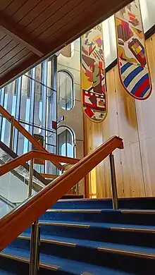 In 1979 Crook was commissioned to produce a set of 20 banners for the Miles Warren-designed New Zealand Embassy in Washington.[6] Hanging in the Great Hall of the embassy building the banners measure five metres by 1 metre and feature South Pacific imagery and heraldry.[6] The banners were made by Nancye Smeaton, manager of the then-New Zealand Ballet and Opera Trust production unit.[5] Between 1981 and 1983 Crook worked on a series of larger banners for the entrance foyer of the Michael Fowler Centre in Wellington.[10]