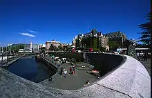 View of the Inner Harbour looking north with VRTS double decked buses along Government Street in front of The Empress, 30 April 2005.