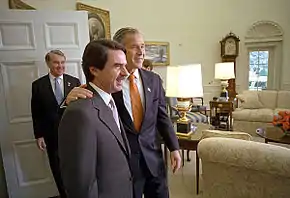 Aznar's government strongly supported the "war against terrorism" declared by President George W. Bush after the 9/11 attacks in New York and Washington, so that when the United States started the war in Afghanistan in October 2001 and in Iraq in March 2003, it had Aznar's support, even though public opinion was largely against the latter.[61]