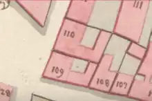No. 110 in Frimand's Quarter was at the time of the 1801 census home to a total of 59 people distributed on eight households. The property was owned by canvas merchant Niels Wahl. He lived there with his wife Anne Maria Hansen, their two daughters (aged 4 and 15) and two maids. His household comprised a total of 17 people.[13] Another household consisted of the customs officer Magnus Biergdahl, his wife, their two children and a maid.[14] The daughter Frederikke Louise Biergdahl (1790-1864) would later marry the painter Christian Ludvig Knutzen.[15] The other households were those of a clerk in the Notarius Publicus' office (Johannes Christian Riisbrigh, four people in the household),[16] a glovemaker (Christen Mortensen Has, six people in the household),[17] a Pallbearer (Amund Floer, two people in the household), a workman (six people in the household),[18] a workman (Christian Frederik Schakheit, six people in the household),[19] a watchman (Carl Hense, four people in the household)[20] and a master shoemaker (Johan Frederik Ibsen, 11 people in the house hold).[21] The property was in the new cadastre of 1806 listed as No. 118. It was by then still owned by Niels Wahl.