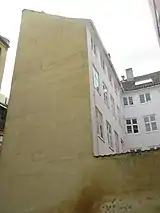 A three-bay perpendicular wing extends from the rear side of the building and is again attached two the five-bay rear wing at the bottom of the small courtyard. The courtyard is to the northwest separated from that of Niels Hemmingsens Gade 32 by a brick wall. The perpendicular wing and the rear wing are both constructed with four storeys over walk-out basements and have monopitched red tile roofs, both pierced by a substantial chimney. The exteriors walls of all three wings are towards the yard plastered and painted in a pale red colour. The green-painted door in the rear wing features a relief of a bull. The rear side of the rear wing faces the courtyard of Løvstræde 12.[41]