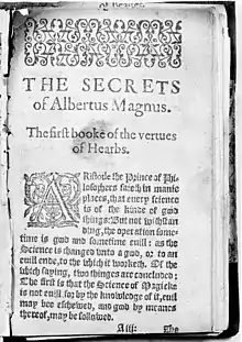 The Grand Albert is a grimoire that has often been attributed to Albertus Magnus. Begun perhaps around 1245, it received its definitive form in Latin around 1493, a French translation in 1500, and its most expansive and well-known French edition in 1703. Its original Latin title, Liber Secretorum Alberti Magni virtutibus herbarum, lapidum and animalium quorumdam, translates to English as "the book of secrets of Albert the Great on the virtues of herbs, stones and certain animals". It is also known under the names of The Secrets of Albert, Secreta Alberti, and Experimenta Alberti.