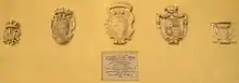 Some escutcheons containing the coats of arms of Grand Masters of the Order are found affixed to the wall of one of the corridors of Neptune's Courtyard. These formerly adorned some of the Order's buildings, but they were removed in the 19th century. They were retrieved by Governor Sir Arthur Lyon Fremantle in 1897, and were affixed to the courtyard "for their better preservation", as indicated by a marble slab below the coats of arms.[28]